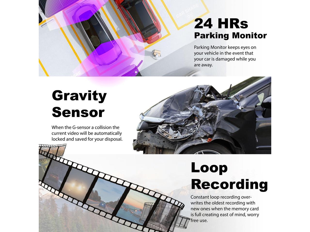 - ACCIDENT AUTO-DETECTION (G-SENSOR) AND PARKING MONITOR: When the built-in gravity sensor detects a collision, the current video is locked, ensuring important footage is kept protected. Locked video will be kept safe from being overwritten. Parking monitor provides 24 hour protection.