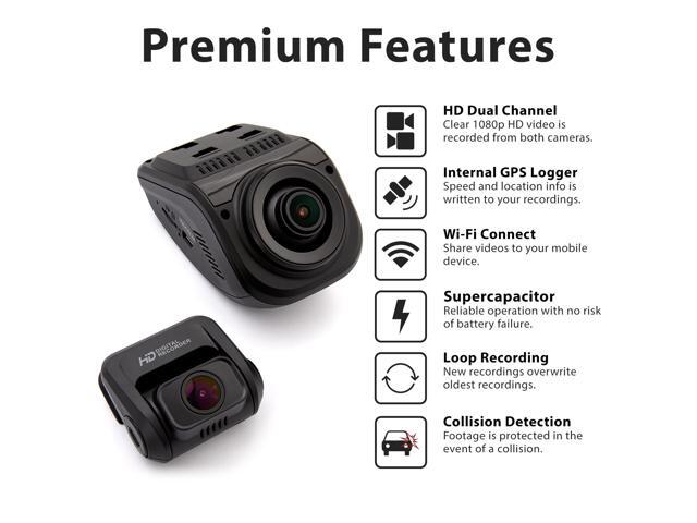 - FULL HD DUAL CHANNEL RECORDING: Front and rear cameras each record 1080p video @ 30fps. WIDE DYNAMIC RANGE allows each camera to perform optimally in low-light situations by carefully fine-tuning the exposure. 170 DEGREE ULTRA WIDE ANGLE LENSES on both cameras open up to capture sweeping views of their surroundings.