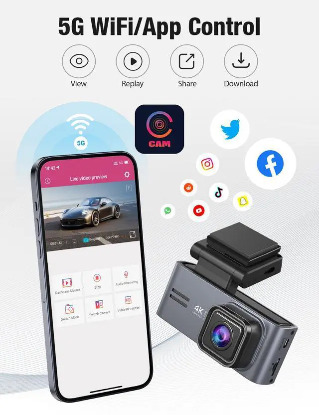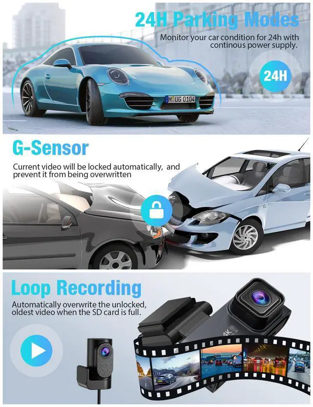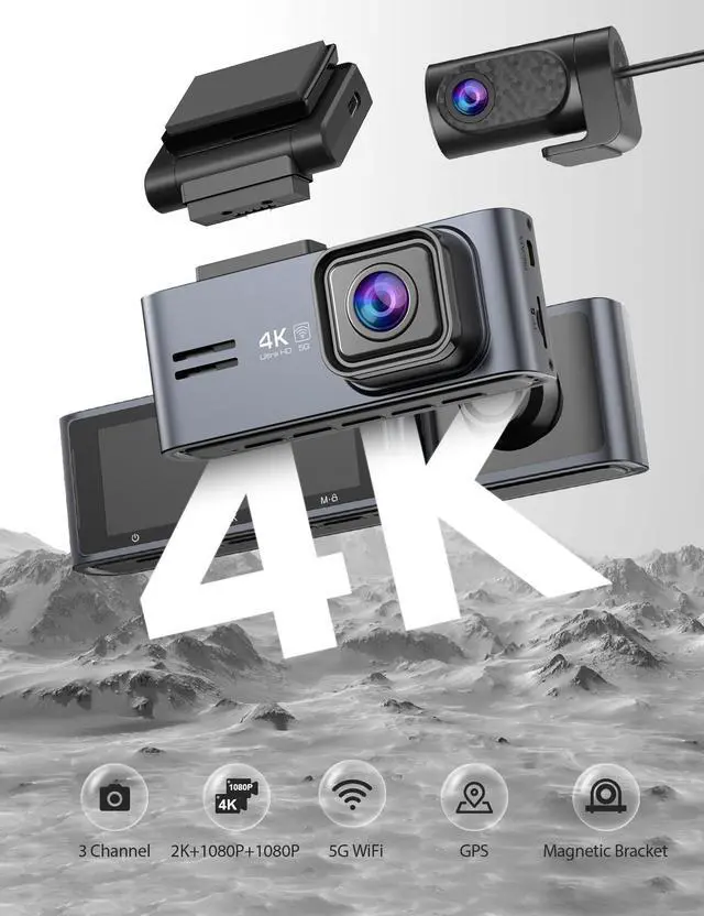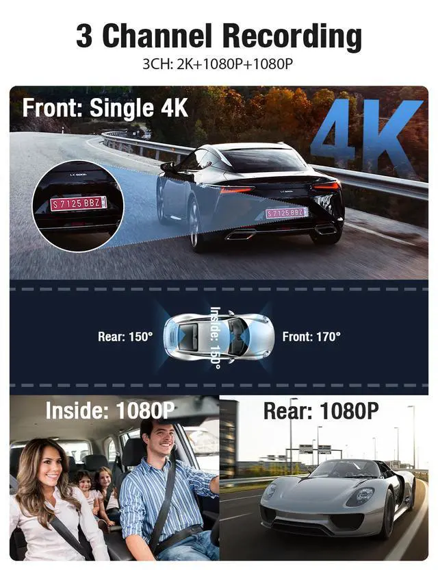 OMBAR 3 Channel Dash Cam featuring 5G WiFi and built-in GPS. This advanced dash camera offers seamless 360° coverage, recording the front, rear, and inside of your vehicle in stunning 2K+1080P+1080P resolution for total peace of mind. The integrated GPS automatically logs your route, speed, and location, while fast 5G WiFi lets you instantly review footage or adjust settings right from your smartphone. With a 3.18" LCD display, enhanced night vision powered by WDR technology, and a reliable G-sensor that locks important files during incidents, this dash cam provides dependable protection day and night. Everything you need is includedtheres a pre-installed 64GB SD cardso youre ready to go straight out of the box. Perfect for rideshare drivers like Uber and Lyft, or anyone seeking maximum security and clear evidence on the road, the OMBAR triple dash cam system delivers 4K/2K high-definition recording and all-around safety in any driving situation.
