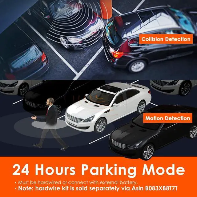 24 Hours Motion Detection or Collision Detection Parking Monitoring: With the energy saving motion detection parking mode, the dash cam will be on standby mode and wake up to record once front or inside camera detect movement. With collision detection, If an impact is detected when car dash cam is off, it will auto on to record the impact. The 3 channel dash cam should be connected to hardwire kit(buy extra ASIN B083XB8T7T) or external battery for parking mode.
