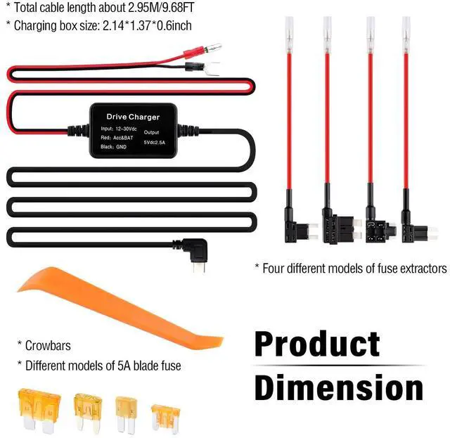 We have carefully prepared 1x dash cam power supply (wire length of 9.68Ft), 1x pry tool, 4x 16AMG fuse tap, and 4x 5A blade fuse to meet your usage and installation needs. The external PC flame-retardant shell and built-in dual intelligent buck chip will definitely make you fall in love with this product! Place your order now and embark on your journey of protection!