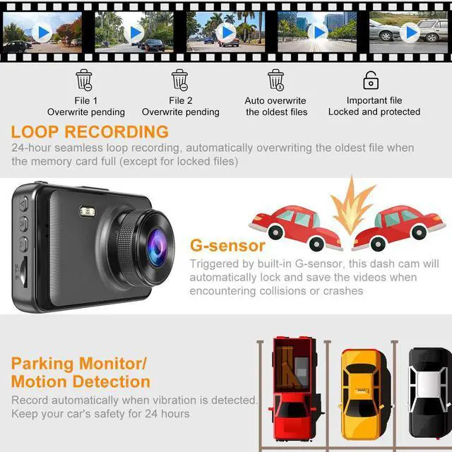 G-SENSOR on DASH-CAMERA & LOOP RECORDING DASH CAM - The dashcams for cars with sd card has highly-sensitive G-sensor, once the vehicle collides, this driving recorder will lock the current video and prevent it from being overwritten to ensure the evidence is intact. The video is automatically saved every1,3,or 5 minutes. When memory card (Package included) is full, the safety camera overwrites the oldest videos to ensure continuous recording,which keep recording your driving journey