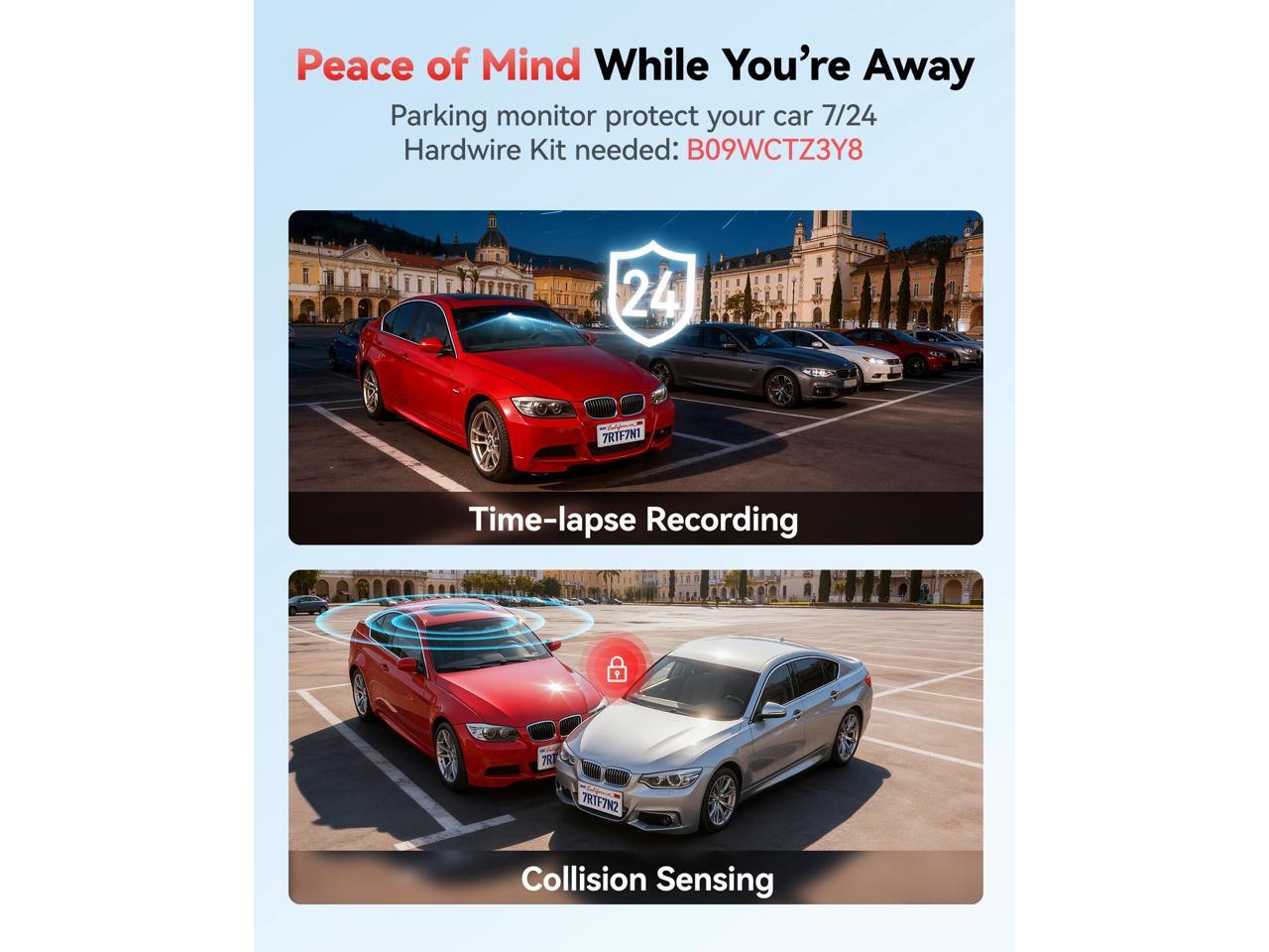 - 24-Hour Parking Monitor: With the 24-hour parking monitor function, the dash cam automatically starts recording upon detecting any impact or motion around your vehicle, ensuring round-the-clock protection.