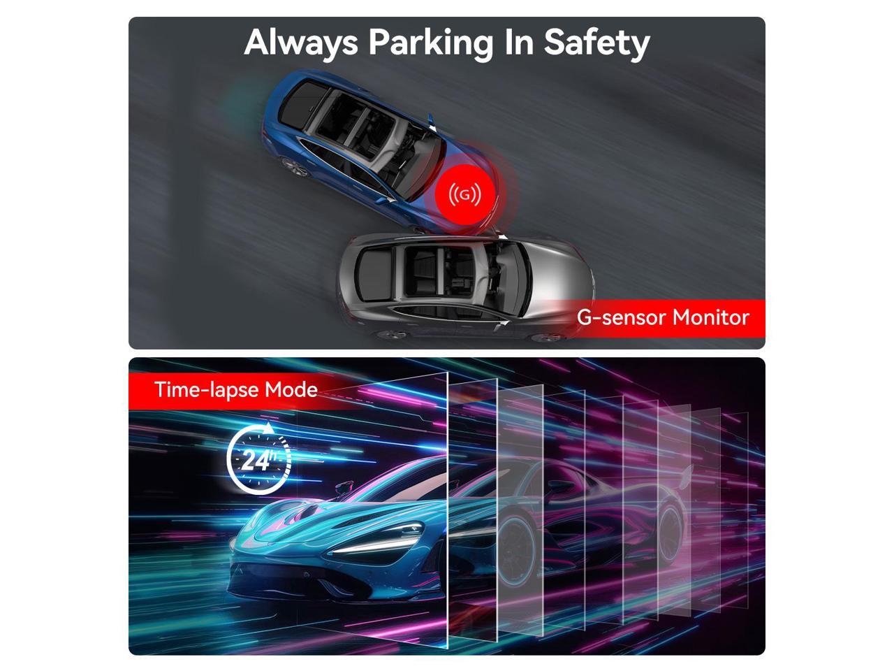 - [G-Sensor and 48H Parking Mode] Automatically saves and locks video files when the G-sensor is triggered. With 48-hour parking monitor(Extra hardwire kit needed) , the car dashcams record even while parked, keeping the car in security.