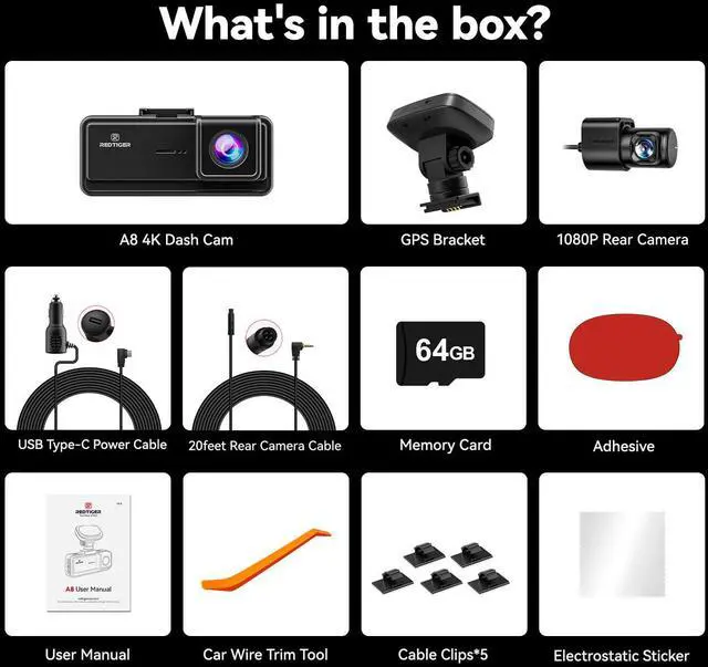 The REDTIGER A8 4K Front and Rear Dash Camera captures sharp dual recording in 4K+1080P. It includes ADAS for lane departure and collision warnings, plus a responsive touch screen, GPS, and WiFi app control. Parking monitor and G-Sensor lock protect important footage, while loop recording ensures nonstop coverage. With an adjustable rotating mount for flexible angles, this car dash camera enhances driving safety and clarity.