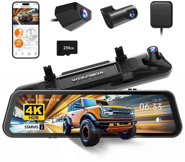[4K Triple Channel Camera] This WOLFBOX rearview mirror camera records in 4K front, 2.5K rear, and 1080P interior for comprehensive coverage. The rear camera features a 1/1.88-inch large sensor, delivering superior light sensitivity with a 2.9m pixel size. It supports 2.5K 2560*1440 resolution at 30FPS, Purecel Plus Technology enhances night vision, setting a new standard for visibility in the dark