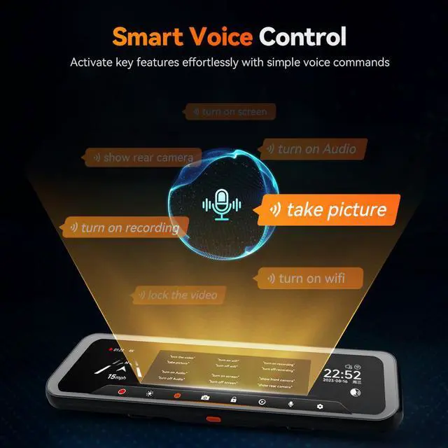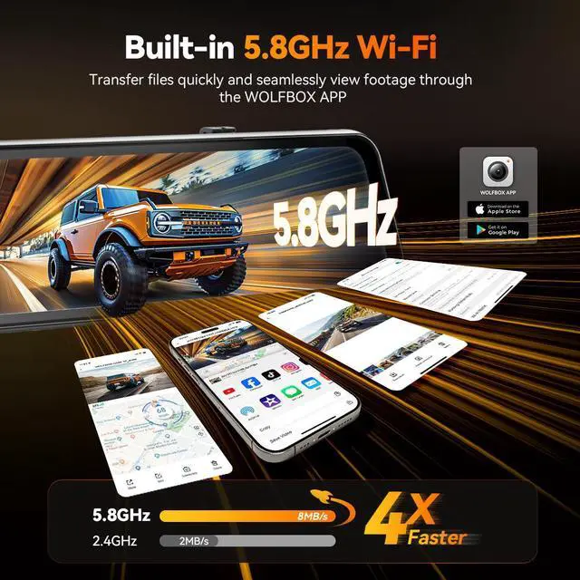 [Convenient 5.8GHz WiFi & Voice Control] Featuring 5.8GHz WiFi, the dash cam mirror provides faster and more stable connections to your smartphone. With the WOLFBOX app, you can easily view live footage, replay recordings, and share video. Experience the convenience of voice control, simply command your 3 channel dash cam to start recording or take photos, keeping your focus on the road