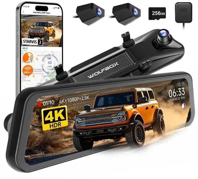 [STARVIS 2 4K Mirror Dashcam] The WOLFBOX G900 Tripro's front camera, featuring the advanced STARVIS 2 IMX678, captures stunning 4K 3840*2160 resolution video at 30FPS. Thanks to the larger photosensitive area of STARVIS 2, it excels in low-light conditions and offers an improved dynamic range. This technology ensures that your footage is clearer and more vibrant, with enhanced contrast and detail, even in challenging lighting environments