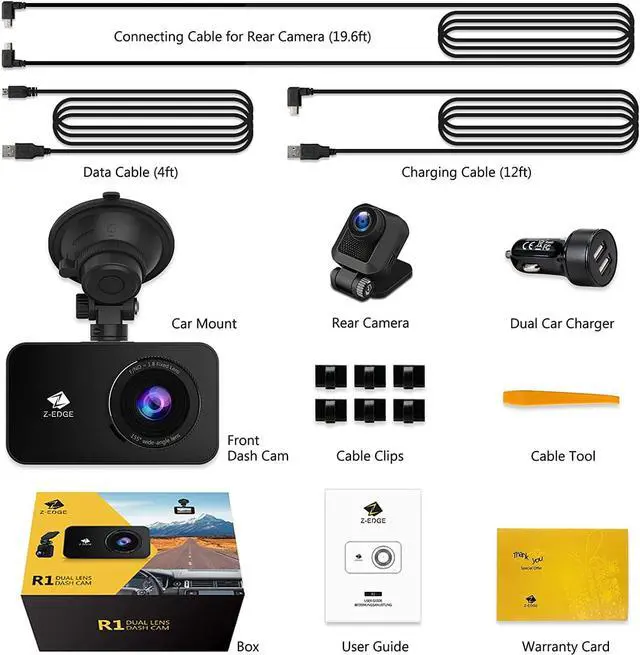 [Accessories Included] The extra-long 19.6 feet USB cable makes it easy to install in your SUV and cable management. When plugged in, the operating temperature at 14°f-158°f. While using the battery power (for the parking monitor), storage temperature at -4°f-158°f. The dual port USB car adapter and the solid suction cup mount are included.