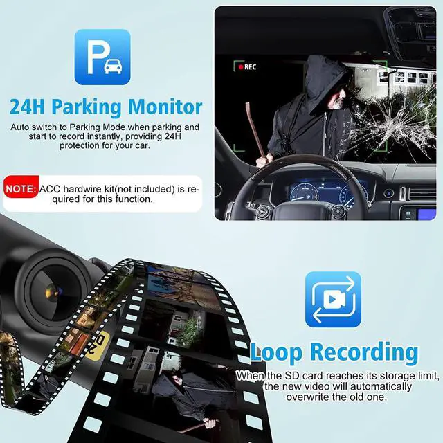 24-Hour Parking Monitor: This feature requires ACC hardwire kit (not included). The car recorder will automatically switch to parking mode when you are parked and continue recording after you are parked, providing 24H protection for your car.