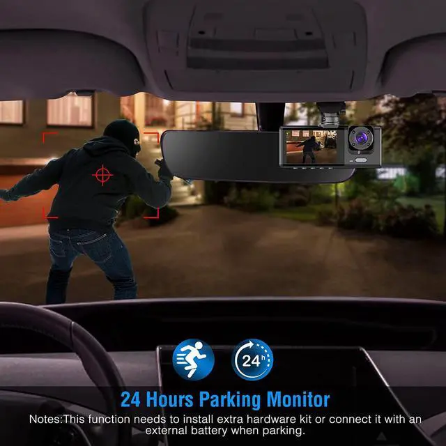 Hours recording: the dashcam will go on recording after your car is parked. (Tips: 24-hour parking monitoring only works with external power supply. Use requires connecting the Dash Cam to an external power source (3-lead hardware kit, not included. )