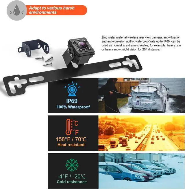Amazing Rear View Camera: Zinc metal material Reverse camera, anti-vibration and anti-corrosion ability, waterproof rate up to IP69, night vision for 20ft distance. Wide viewing angle with 170 degrees, covering 90% blind area back of the car to make sure safe drive