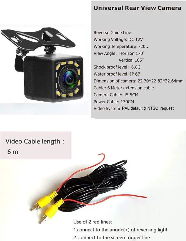 Power supply: DC 12V - video cable connection. A wide camera lens viewing angle makes sure that you can see enough to park and reverse safely.