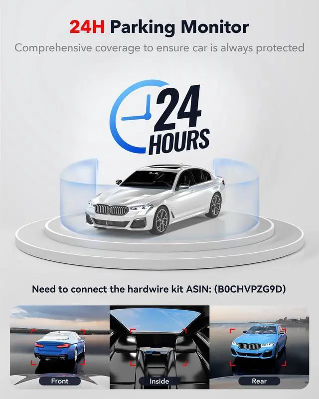 The dash cam will automatically record a 10-second video and lock it up when certain emergency occurs.Peace of Mind When You Leave Your Vehicle.Hardwire kit is needed.(ASIN:B09WCTZ3Y8/B0CF54C4NK)
