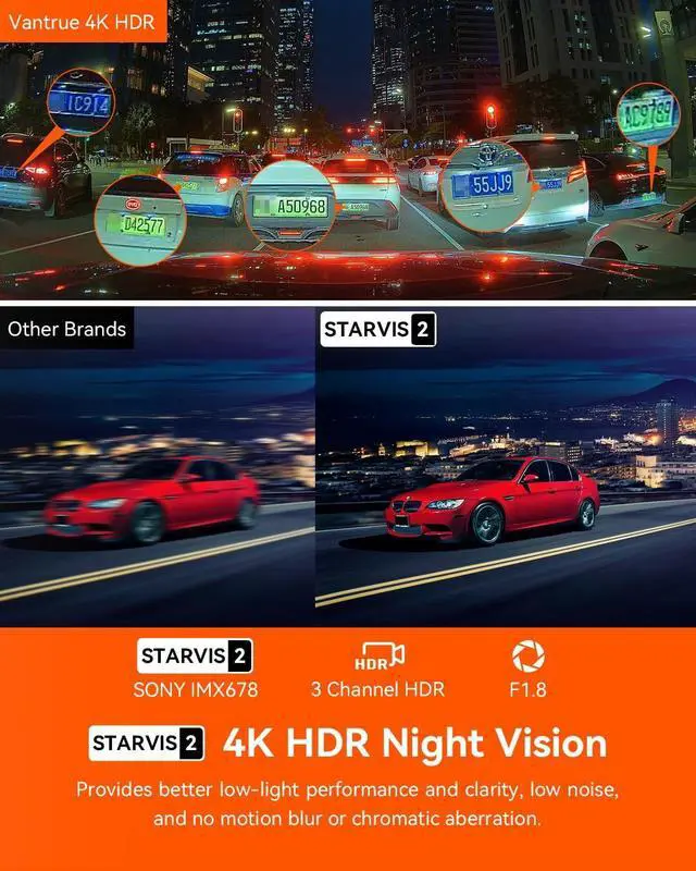 [ 4K HDR SONY STARVIS 2 Super Night Vision ] Adopting SONY STARVIS 2 image sensor, which can provides better low-light performance and clarity compared with STARVIS, enabling the N4 PRO dash cam to record images of moving vehicles more accurately and quickly, without blurring or chromatic aberration. Combined with 4K HDR technology to help adjust over- or under-exposed areas for balance lighting in the image, this allows the N4 PRO dash cam to restore 4K details for the best night shots.