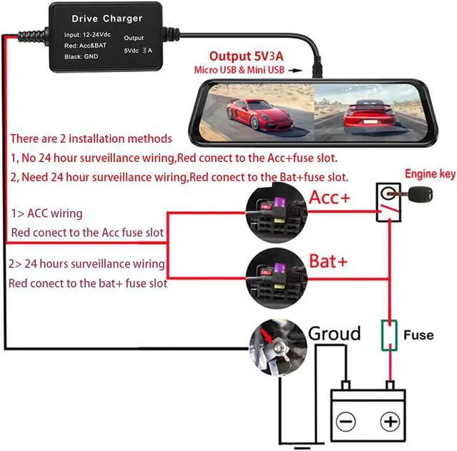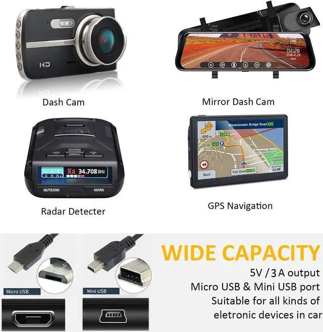 Wide CompatibilityThis hardwire kit is suitable for most car models(Voltage between 12-24V). Our hardwire kit Equipped Mini USB and Micro USB ports, works for almost all car mini USB & Micro USB ports device, such as dash cammirror camGPS navigator and radar detector etc (Not fits for device)