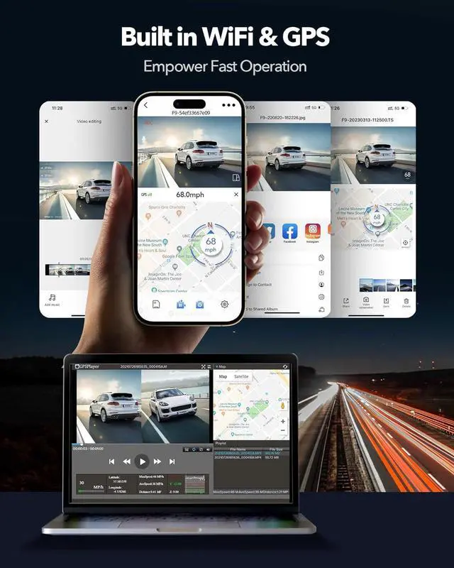 [Smart APP Control and WIFI GPS] For real-time video, recorded video playback and GPS information, connect to the app with the built-in WiFi (Within five meters). Instead of using buttons, you can effortlessly control the dash camera with the app.