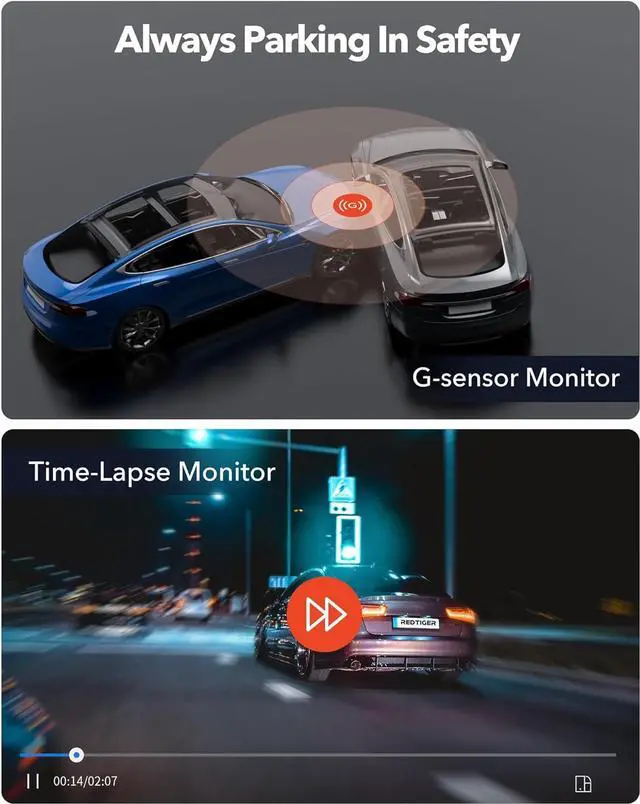 [G-Sensor and 48H Parking Mode] When the G-sensor is triggered, video files are automatically saved and locked. This dash camera for cars can record even while parking with a 48-hour parking monitor(Extra hardwire kit needed, ASIN: B0B658WC3H), which keeps the automobile secure.