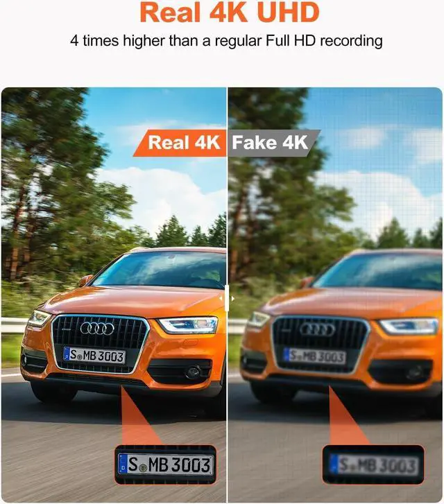 Real 4K Dual Dash CamWhat is a real 4K dash cam D22 4K dash camera is exactly that. It uses a native 4K (3840x2160@30fps) sensor, authentic 8 million and super large pixels, using the most advanced ISP (Image Signal Processor), and unique 4D noise reduction technology, this is the difference between 4K dash cam and other 4K dashcams, which is why the D22 video effect is so impressive.