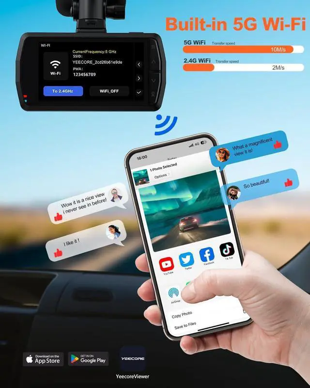 Built-in 5G WiFi GPS with SpeedometerThe car dash camera has built-in 5G WiFi, which is 5 times faster than 2.4G WiFi. The free "YeecoreViewer" mobile app lets you easily control the live view dashcam and download videos. The car camera built-in GPS, and the unique GPS anti-jamming design can obtain GPS information within one minute. There's no need for an extra GPS antenna, as the one-cable design simplifies installation.