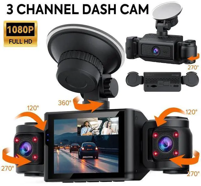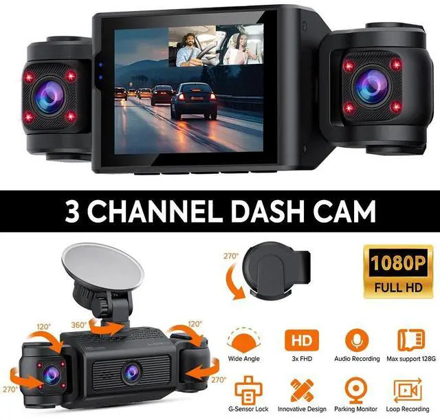 Triple Dash Cam: This 3 channel dash cam features with a 170 wide-angle front camera + 120°Cabin, reduce visual blind areas. The Screen made by IPS panel, It allows you to see a clear picture at any angle without any blurring.