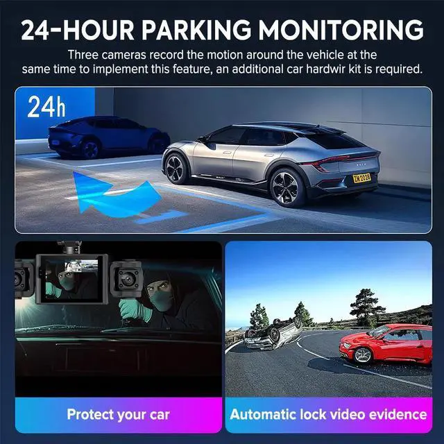 6.24 Hours Parking Monitoring: While your car is parked and the engine is off the dash cam front auto-start and record a short video once it detects bumps by someone in parking, these videos will be saved & locked, thus providing you with video evidence. (You need to purchase a hardware kit connected to enable 24/7 parking monitoring, Not included. )