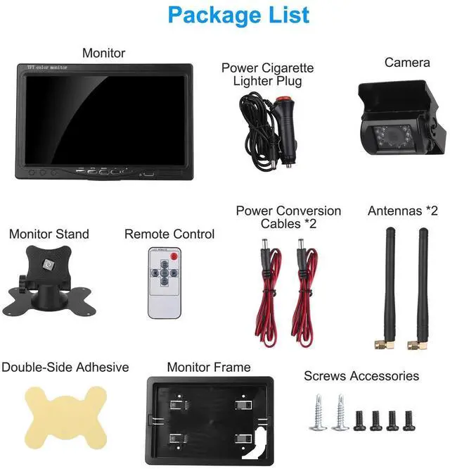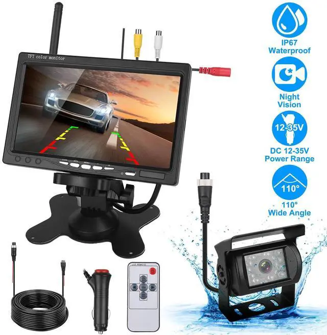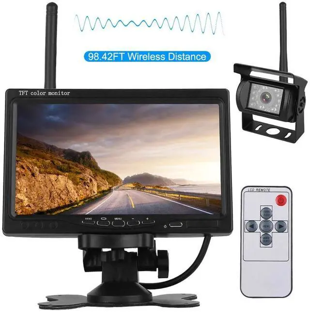 - Wireless & Remote Control:Come with wireless monitor and reverse camera,just connect the power then choose V2 and the according frequency "2307" to finish wireless connection between monitor and camera. No other messy cables needed,more convenient and simple. Besides,antenna can be added to enhance signal. With a remote controller,easy to turn on/off the monitor and set different modes with no use reaching for the monitor.