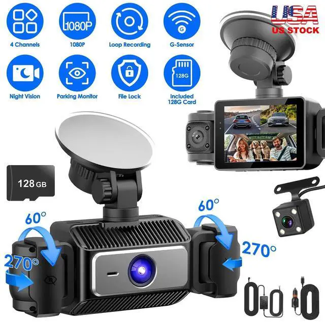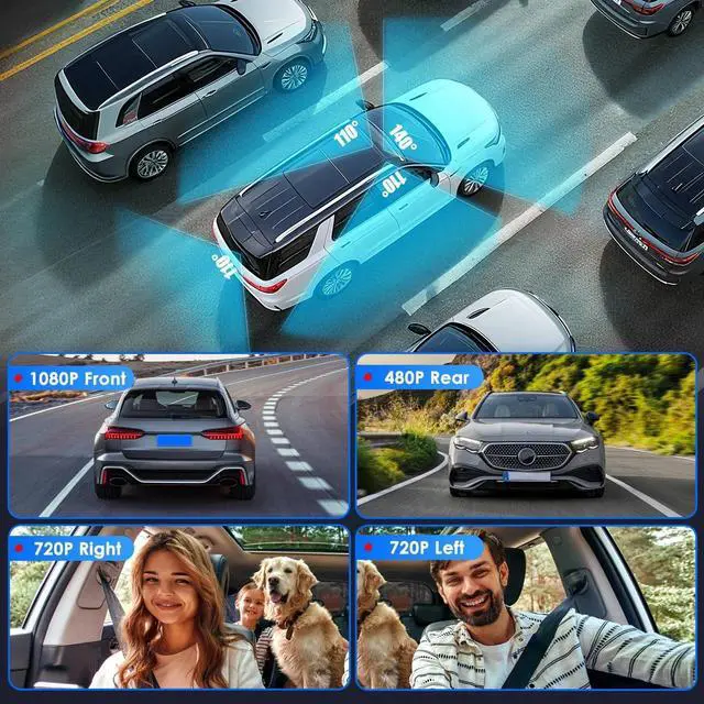 - 4 Channels Car Dash Cam:Our upgraded 360° surveillance 4-channel car dash cam comes with 1080P front,720P right and left interior,480P rear cameras,providing all-around coverage of your vehicle's surroundings. Front camera with 140° wide viewing angle, 110° rear camera and rotatable right & left camera with 110° viewing angle help to prevent disputes by providing clear evidence in case of accidents or insurance claims.