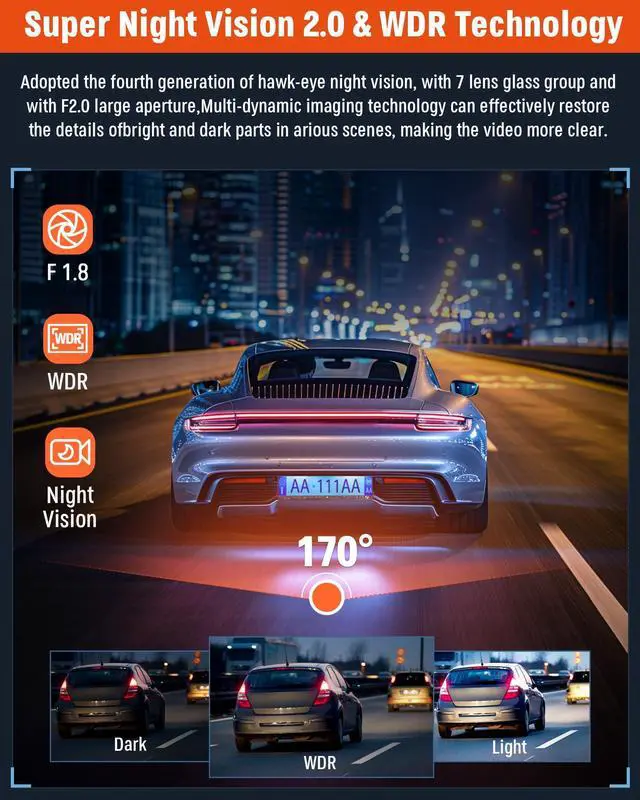 | Included Components | 1 x 4K front dash cam, 1x 1080P rear camera ,1x Vehicle Charger ,1x Rear Camera Connection Cable ,1x Installation bracket ,2x Installation screws ,1 pack of static cling stickers |