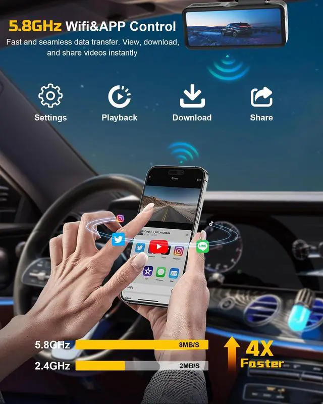 Lightning-Fast 5.8GHz WiFi & Intuitive App: Say goodbye to fumbling with tiny SD cards! Connect to your dash cam effortlessly via superior 5.8GHz WiFi (offering faster speeds and less interference than standard 2.4GHz). Our user-friendly mobile app allows you to: