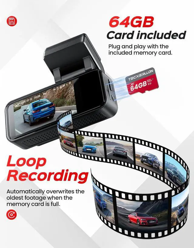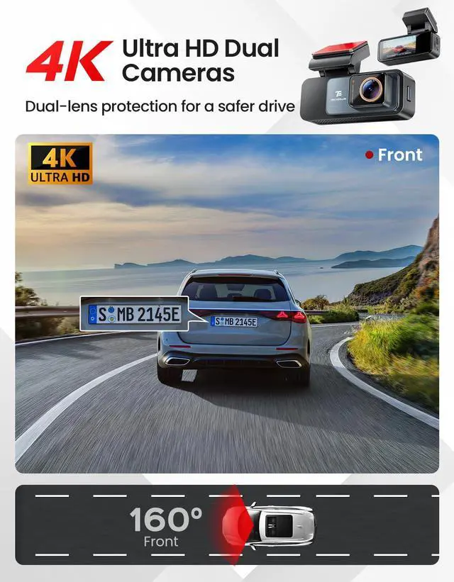 Ultra HD 4K Front Recording: TECXLERON front dash cam records in stunning 3840×2160P resolutionensuring detailed coverage of the road ahead. With a 160° ultra-wide-angle front lens, it minimizes blind spots and captures crucial details across multiple lanes.