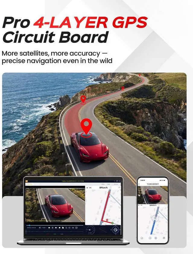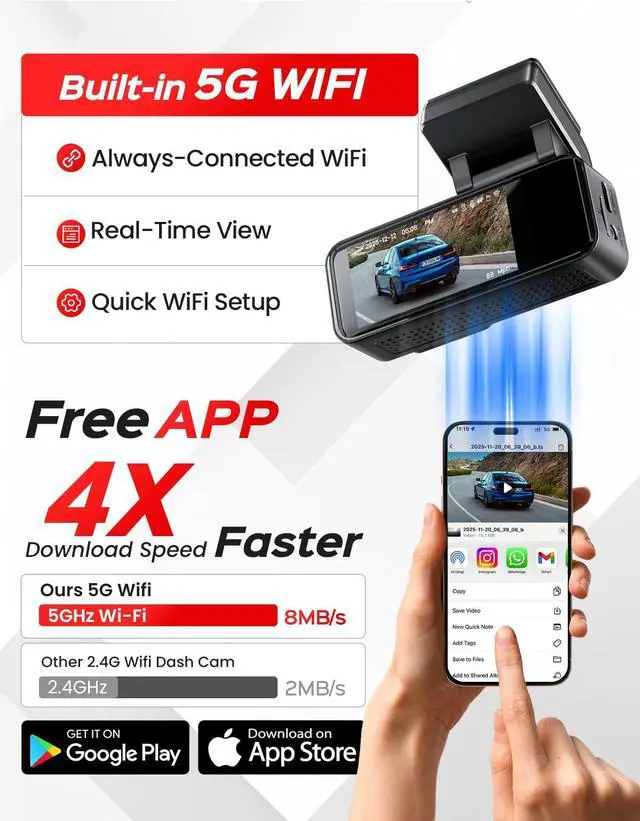 Built-in 5G WiFi & GPS Tracking: Connect effortlessly via 5.8GHz WiFi to instantly view, manage, and download recordings directly to your iOS or Android device. Share important moments on social media or with insurance providers in just a few taps. The integrated GPS module logs precise driving routes, location, and speed directly onto each video.
