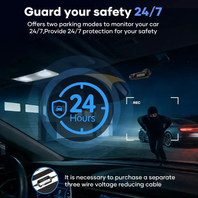 24-hour parking mode: This HD 1296P dash camera will automatically switch to parking mode when your car is parked. Continuous recording with low power consumption and low frame rate. This driving recorder will provide 24/7 protection. (Note: This feature requires a three wire voltage reduction line, sold separately)