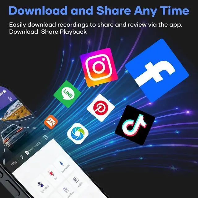 Built in 2.4GHz WiFi and APP control: This dash camera for cars is equipped with 2.4GHz WIFI and an APP suitable for Android or iOS smartphones, making it easy to access live streams, download videos, change settings, and edit. You can share your footage on YouTube, Twitter, Facebook, or social media platforms, allowing you to share any journey with all your friends.