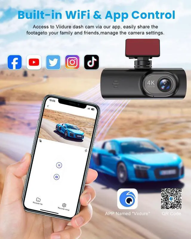 Built-in WiFi & App ControlThis dash cam features built-in WiFi, making it easy to connect directly to your smartphone. With the app, you can view, download, and manage recordings on your phone, ensuring fast and effortless access to your car dash cam footage.