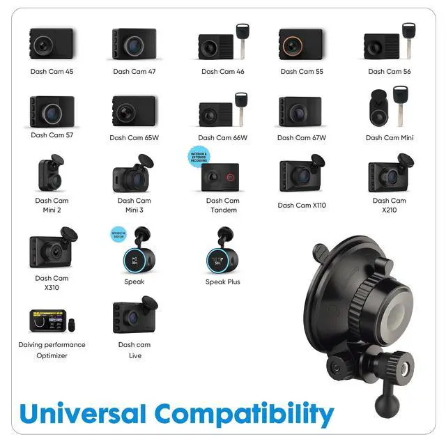 Compatible with Garmin dash cam 45/46/47/55/56/57/65W/66W/67W/Mini/Mini 2/Mini 3/Tandem X110/X210/X310/Speak/Speak Plus/Live/Catalyst Driving Performance Optimizer.