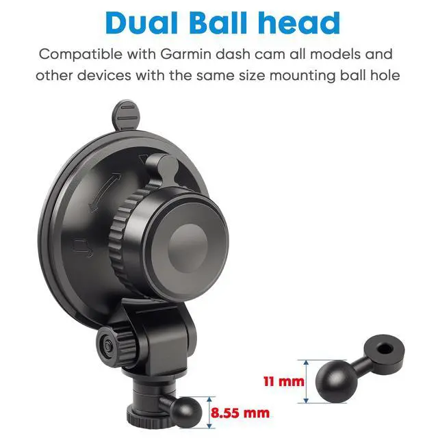 Small and unobtrusive design that wont block your view. Features a unique suction cup locking mechanism for a secure hold on the windshield. Equipped with 8.55mm and 11mm dual ball heads, compatible with all Garmin dash cams.