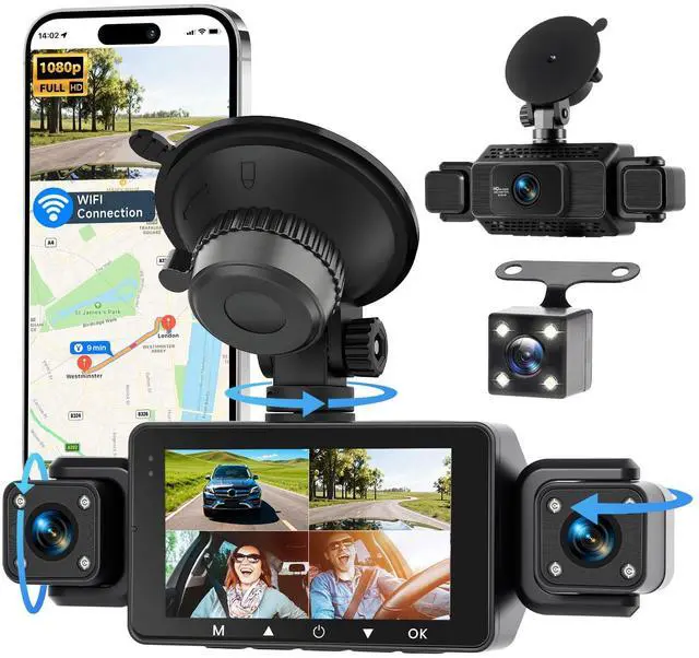 4 Channel Dash Cam Front and Inside Rear, 3 Inch 1080P Full HD Car Camera, 360° Car Dashcam with WiFi & App, Night Vision, Parking Mode, G-Sensor, Loop Recording