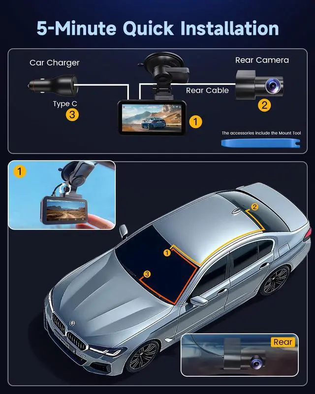 24-hour Parking Mode & Superor Night VisionWhen parked, the car camera - dash cam front and rear automatically switches to parking mode to provide monitoring & protection.Time Lapse, which continuously records at low frames per second to help save power and storage space. It's requires an additional ACC hardwire kit. F1.5 Extra-large aperture, clear capture details in low-light environments