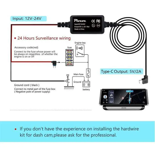 This Type C USB port converter hardwire kit. Perfect for 24/7 Parking Surveillance.Low voltage protection protects against battery dying.Plozoe Dash cam hardwire kit works for almost all car USB C device, such as dash cam?mirror cam?GPS navigator etc.