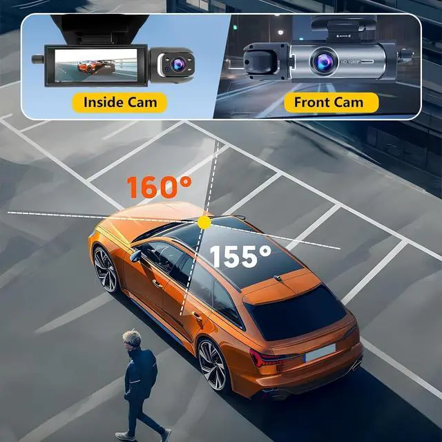 Dash Camera Front and Inside CameraEquipped with a 160° ultra-wide-angle front camera and a 155° rotatable inside camera, it simultaneously records the road ahead and the inside of the vehicle in split-screen mode. Whether you're capturing scenic drives, ensuring safety for ride-hail/taxi drivers and passengers, or monitoring children and pets in the back seat, the synchronized dual-screen recording provides a comprehensive view for greater peace of mind on the road.