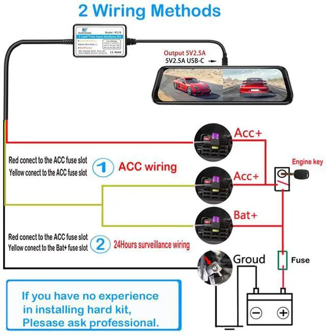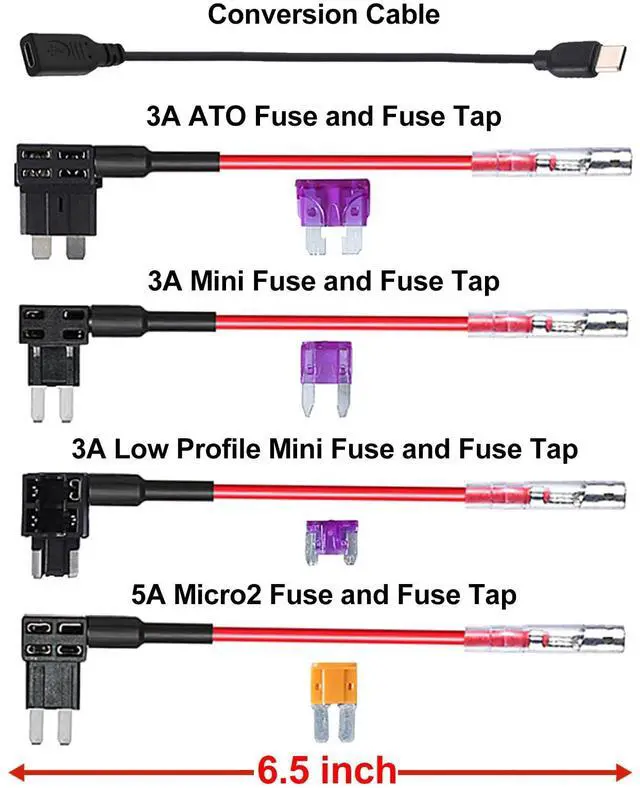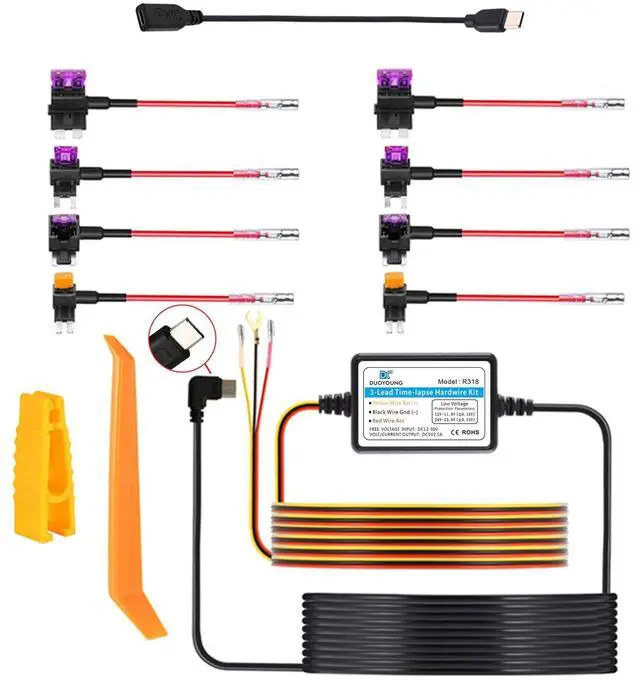 We provide cables that can be adapted to different car fuse boxes, the cable hardwire kit is suitable for most car models (voltage between 12-24V). Our hardwire kits are suitable for almost all car Type-c devices, such as dashboard cameras, rearview mirror cameras, GPS navigators and radar detectors, etc. The ACC signal defaults to Type-c B8, and we have a short adapter cable to convert from B8 to B5.