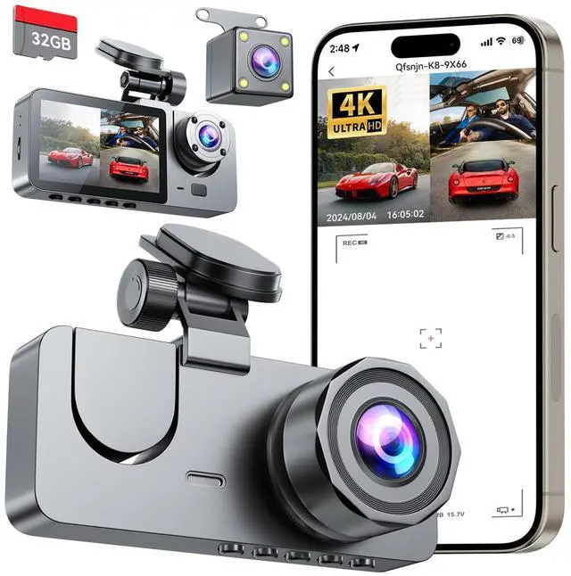 3 Channel Dash CamThis Dash Camera has 3 cameras, the front HD 4K camera with 170° wide angle view, the 1080p interior camera with 150° field of view, and the 1080p rear camera with 160°. Ensure that your car is under 360° surveillance. The Cameras with F/2.0 aperture, 6-layer optics, Wide Dynamic Range technology, and 4 infrared light enhancements to ensure clear video recording even in night conditions!