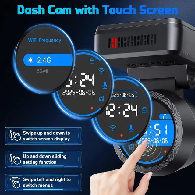 This touchscreen dash cam allows you to slide up, down, left, and right.