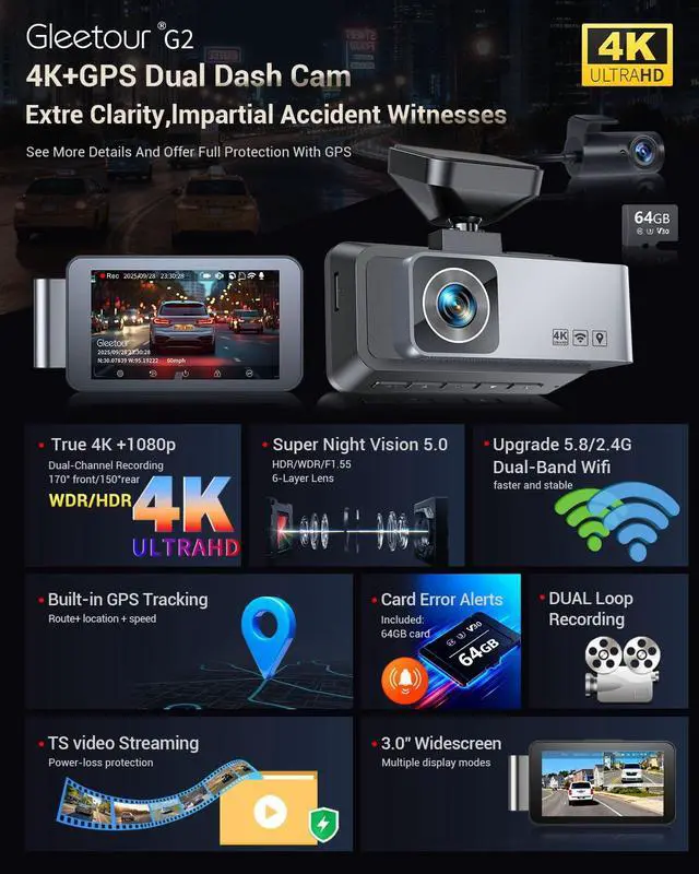 Dash Cam Front and Rear, 4K HDR Dash Camera for Cars, 3" IPS Screen Dash Cam Built-in GPS with 5.8G WiFi UHD Night Vision Free 64G Card, Parking Monitor, G-Sensor