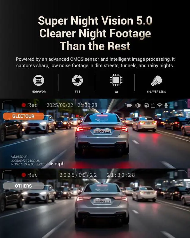 Superior Night Vision: Equipped with premium optical lenses, a large F1.55 aperture, and six layers of glass, this dash camera for cars integrates HDR, WDR, and 3D DNR technologies, enabling clear recording in low-light conditions and capturing every crucial detail.