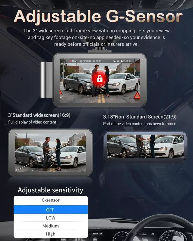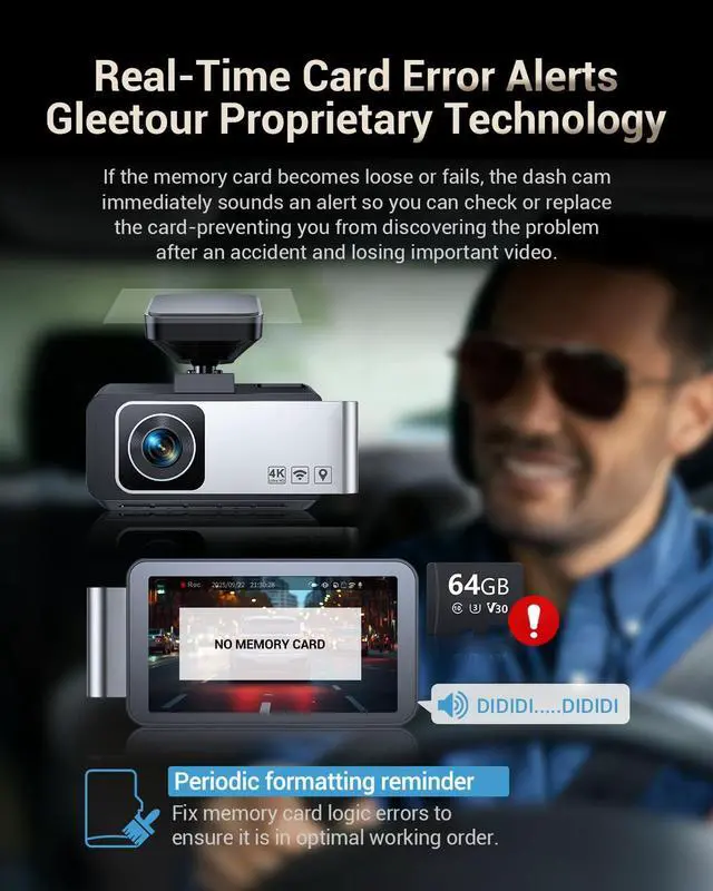 Memory Card Failure Alert to Protect Data: When the memory card fails (due to damage, disconnection, or incompatibility), the dashcam emits a continuous "DIDI" audio alert to prompt the driver to take immediate action, preventing recording interruptions. Dual storage loops independently to ensure that every second is securely recorded without interference between emergency and regular videos.