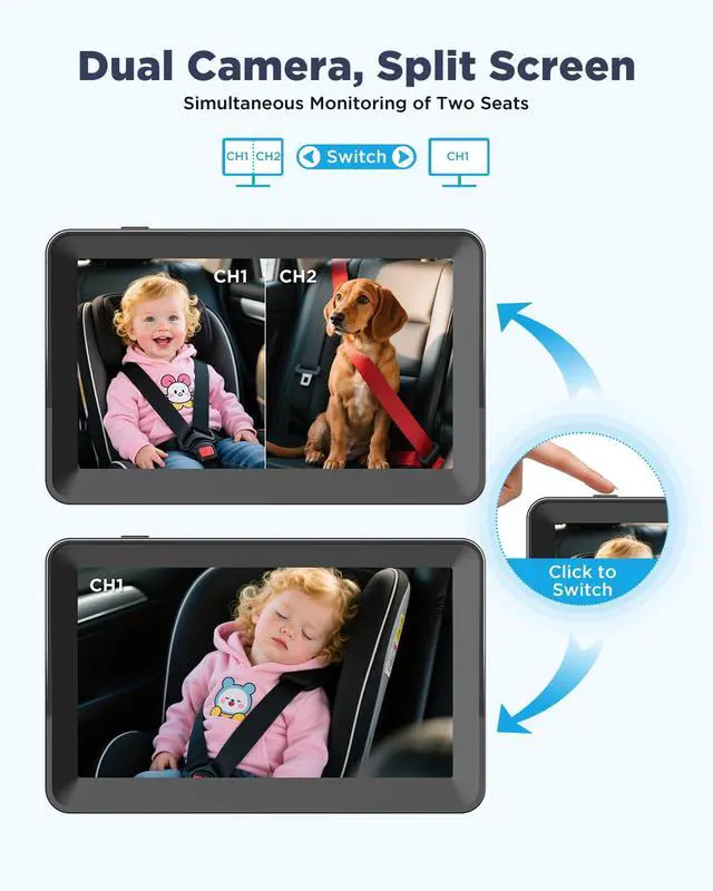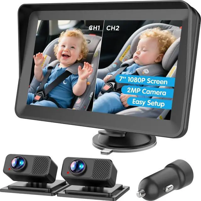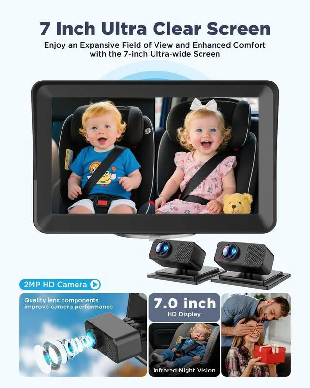 Ultimate Dual Monitoring with Split-Screen Clarity: Dual 1080P HD Cameras & 7" IPS Split Screen Effortlessly track twins or siblings in real time with two crystal-clear cameras and a vibrant 7-inch display. The split-screen technology lets you watch both kids simultaneously, while the anti-glare screen adapts to sunlight or darkness, keeping your eyes safely on the road.
