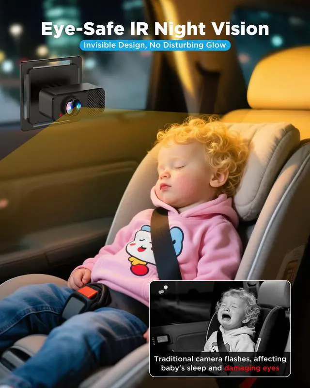 NightGuard Pro: Safe, Auto-Adjusting Night Vision: Zero-Glare Infrared Tech & Auto-Dimming Our 940nm IR night vision activates instantly in low light, delivering sharp footage without harsh lights that disturb your babys sleep. The smart sensor adjusts brightness to protect delicate eyes, ensuring peaceful naps during late drives.