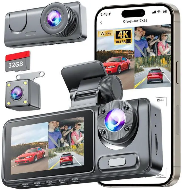 3 Channel Dash Cam for Cars Front Rear Inside, 4K WiFi Dash Cam w/ 32GB Card, 2.0" IPS Screen Dashboard Camera Recorder with App Control, G-Sensor, Loop Recording, Night Vision, Parking Monitor